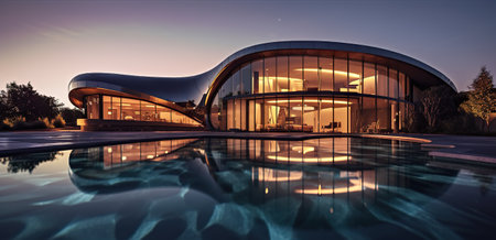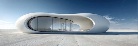 Unique and futuristic building showcases smooth curves and large glass panels, set in an expansive open area under a clear blue sky.