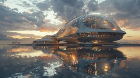 Futuristic buildings with sleek curves create an eye-catching skyline as the sun sets, casting colorful reflections on the water below, enhancing the urban atmosphere.
