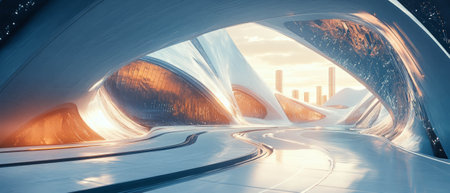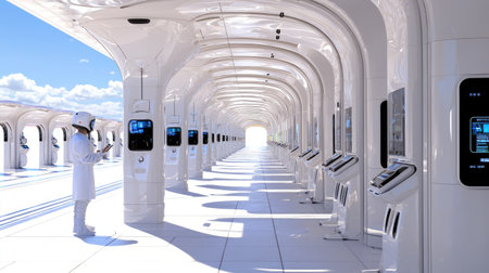 This image showcases a bright, futuristic corridor featuring sleek design and advanced technology interfaces, offering a unique perspective on innovation and exploration.