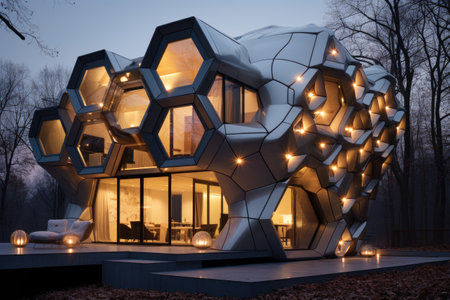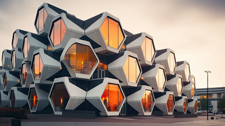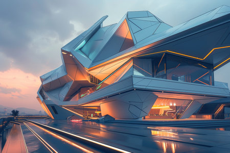 A large building with numerous windows on top showcasing its modern design, A futuristic building with unique geometric shapes and LED lighting