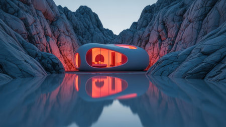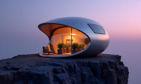 Modern capsule home perched on a cliff at sunset with warm glow from interior lights