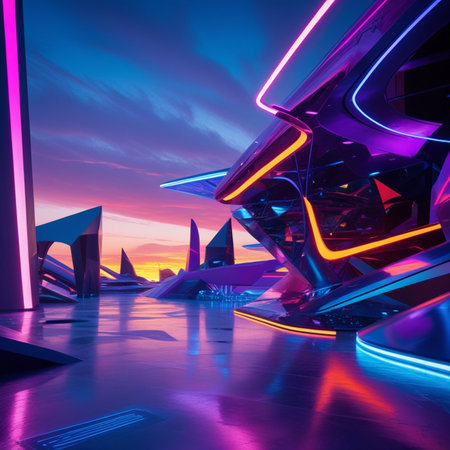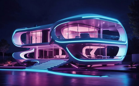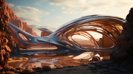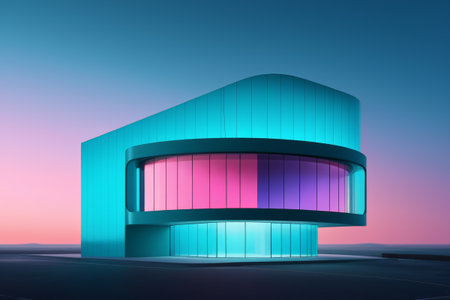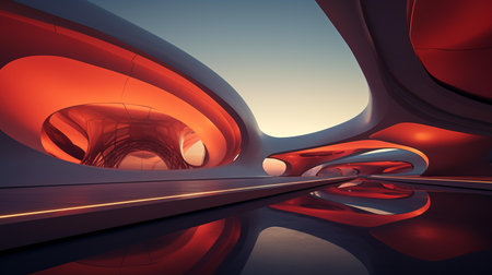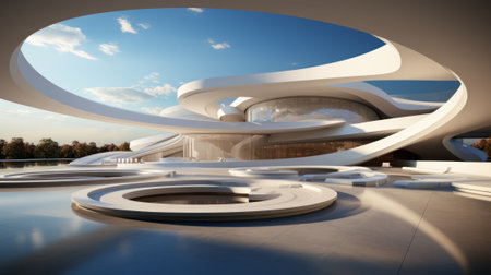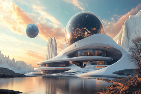 Futuristic architecture features smooth surfaces and geometric shapes in a vibrant landscape