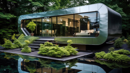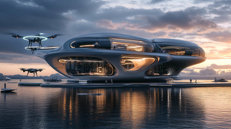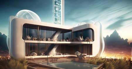 This image showcases a futuristic home design, featuring a multi-level structure with large windows and solar panels. The design incorporates a drone and advanced technology, suggesting an innovative approach to living. The overall aesthetic is sleek and modern, set against a backdrop of a natural environment, making it suitable for architectural, technological, or lifestyle projects.