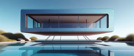 Futuristic floating house with panoramic glass walls and infinity pool.