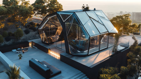 A futuristic glass house with a geometric design, smart home automation, and a stylish rooftop terrace.