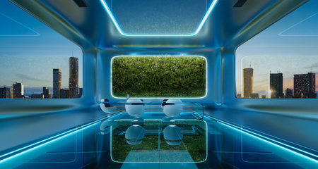Modern futuristic interior office design with green wall plant and beautiful cityscape view. 3d rendering