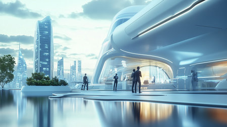 A stunning futuristic urban landscape showcasing sleek, modern architecture beside tranquil waters reflecting the sky. Perfect for innovation themes.