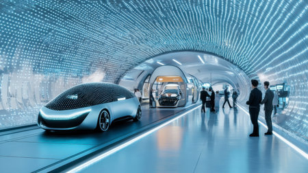 A sleek autonomous vehicle navigates a high-tech urban tunnel, showcasing modern design and innovative transportation ideas, with people observing the future of mobility.