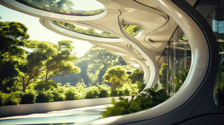 A futuristic corridor surrounded by lush greenery and modern design elements