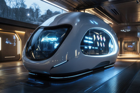 A modern pod stands at a futuristic station, illuminated by soft lights, as dusk casts shadows.