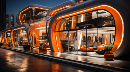 A row of fashion stores in California, The building is orange white and black, the hue is sunset dusk, Cyberpunk. Generative AI