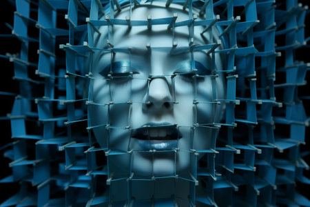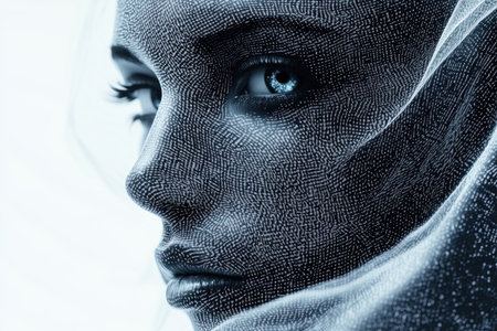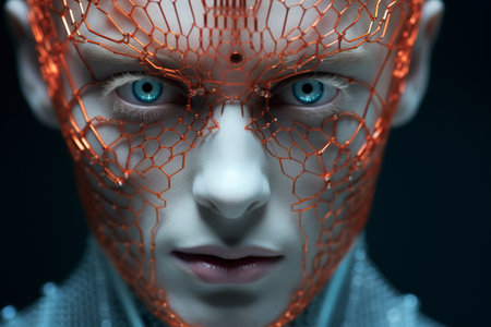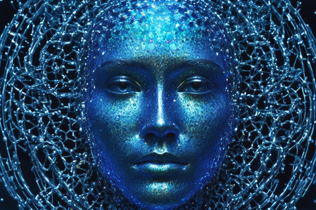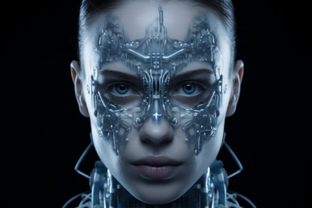 Close-up of a womans face displaying intricate circuit patterns and electric blue tones, merging technology with human features in a surreal design.