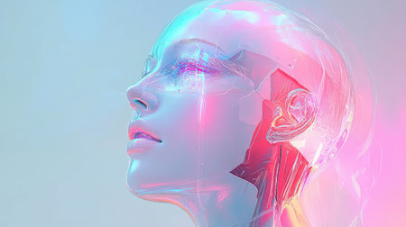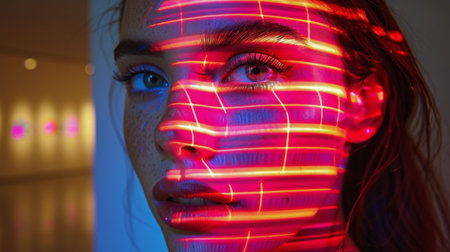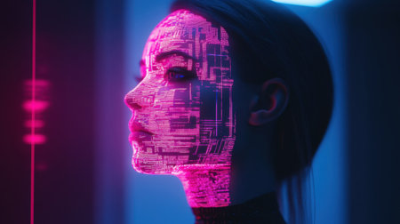 A striking portrait showcasing a woman with a digital circuit pattern projected onto her face, illuminated in a captivating neon pink hue, symbolizing the fusion of technology and beauty.