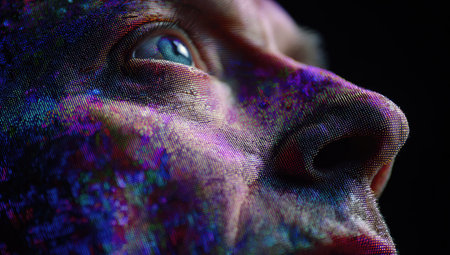 Close-up image of a human face, with a digitalized texture and vibrant colors applied to the skin. The texture appears pixelated or mosaic-like, giving a unique artistic style.