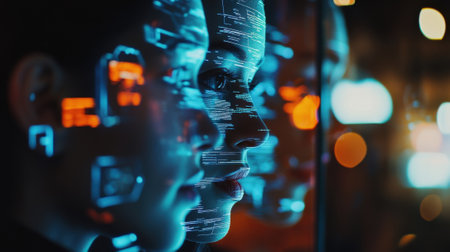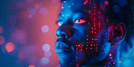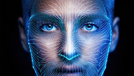 A blue and red digital network overlays a persons face, highlighting the intricate patterns used in facial recognition technology.