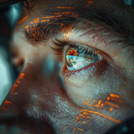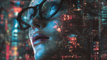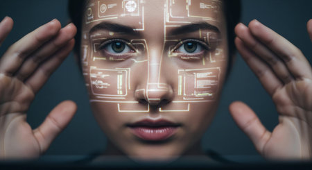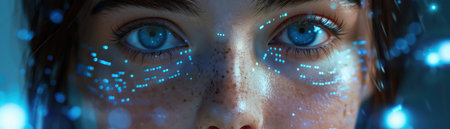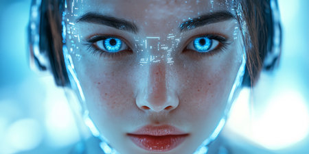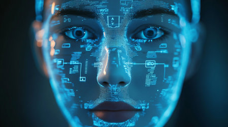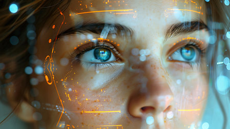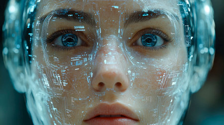 A close-up of a woman's face with digital overlays symbolizing the integration of human and technology, artificial intelligence, and biometrics.