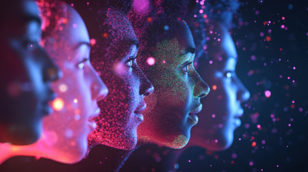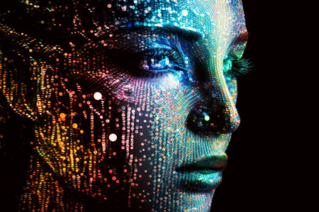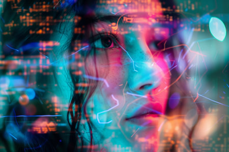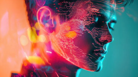 The profile of a young individual is enhanced by vibrant, glowing digital patterns, creating a striking contrast with the colorful backdrop.