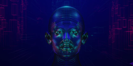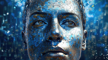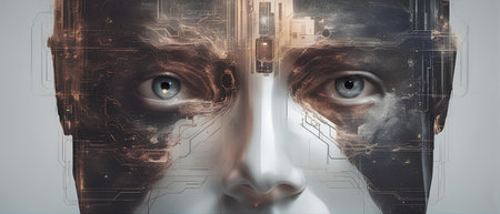 3D illustration of a human face intertwined with AI circuitry. Representation of digital transformation and the future of artificial intelligence in humanity.