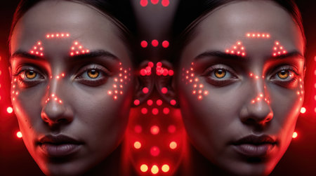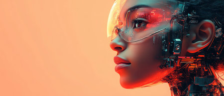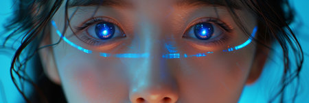 Futuristic portrait of a woman with glowing lines on her face and red light in her eyes