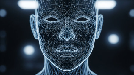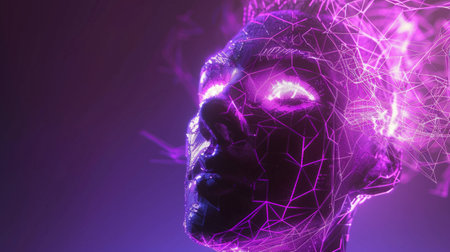 Digital Polygonal Face - A human face constructed from intelligent geometric shapes with visible network connections.