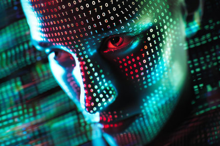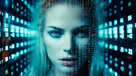Close up of female cyborg face with binary code. Artificial intelligence concept