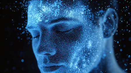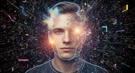 A striking portrait of a man's face dissolving into a vibrant, abstract digital landscape of light and data.