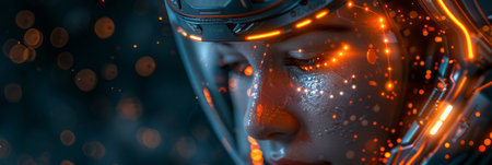 A young woman with cybernetic enhancements gazes thoughtfully, illuminated by warm orange light in a futuristic environment.