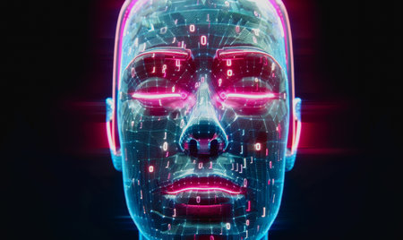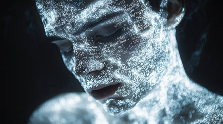 A profile of a human face created from glowing machine code on a dark blue background. Sequins and shiny lines on the background. Concept of artificial intelligence and neural network. Generavite ai.