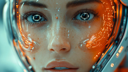 A woman in a space suit with glowing eyes stands in a futuristic setting, showcasing advanced technology and exploration beyond Earth.