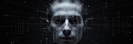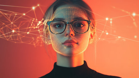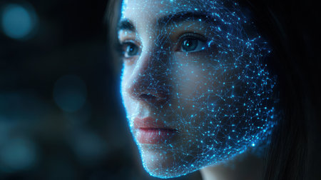 Biometric facial scan maps a womans facial features, creating a network of interconnected nodes, highlighting advanced technology in security, recognition, and cosmetology