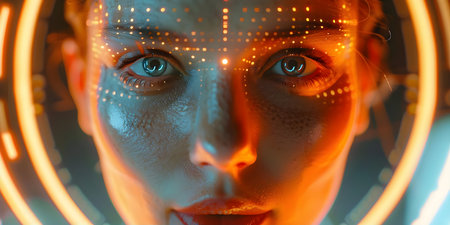 Woman's Face Closeup Undergoing Futuristic Facial Recognition for Biometric Verification in Cyber Security. Concept Facial Recognition Technology, Biometric Verification, Cyber Security