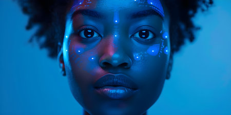 A close-up portrait of a woman's face illuminated by glowing blue neon lines, resembling a circuit board, against a dark background. She has a serious, intense gaze, and a bright vertical light bar is visible to her left, enhancing the futuristic and cyberpunk aesthetic.