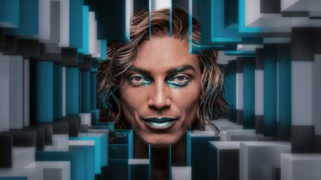 A man with blue eyes and a smile in front of geometric shapes, AI