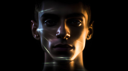 A young woman stands against a dark background. Digital lines and shapes overlay her face, creating a modern look. The setting emphasizes her features and highlights an artistic style.