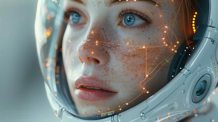 Futuristic interface being projected on a woman's face, showcasing advanced technology and innovation