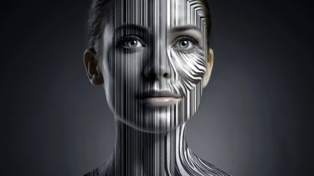 A surreal portrait of a consumer with barcode patterns on their face. Symbol of a major environmental problem caused by urban overconsumption waste. Abstract image