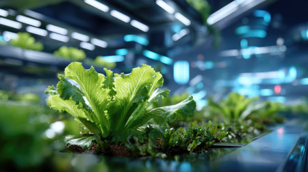 This image showcases vibrant lettuce plants thriving in a cutting-edge hydroponic farm. The futuristic environment highlights advanced agricultural technology, emphasizing sustainability and modern food production methods.
