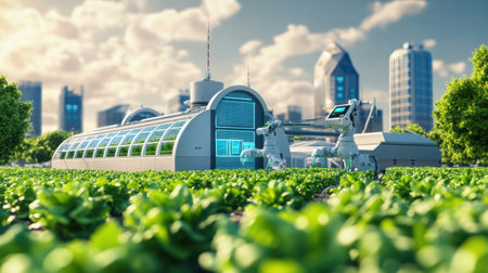 Robotic harvesters work alongside hydroponic greenhouses in a sleek, modern agricultural setup surrounded by urban architecture under a clear sky.