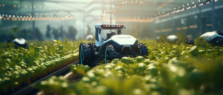 A sleek futuristic agricultural robot navigates a modern greenhouse, tending to lush crops with an advanced hydroponic system, showcasing the future of farming.