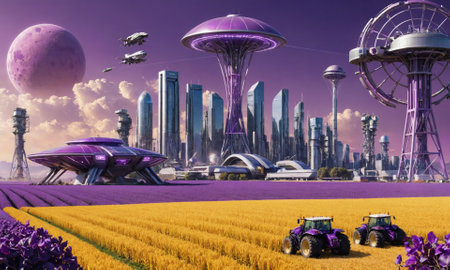 A futuristic city skyline with flying vehicles and a giant Ferris wheel, as two tractors drive through a field of lavender and wheat