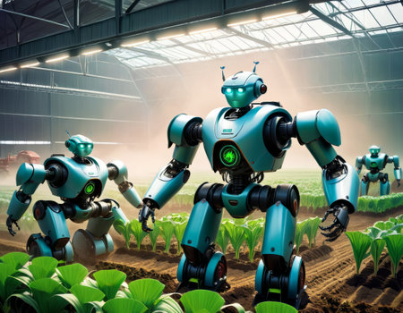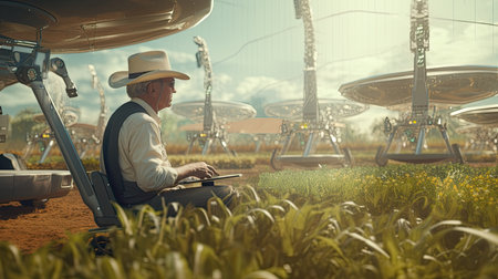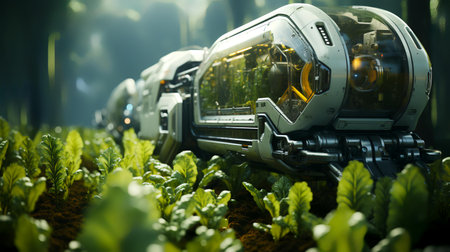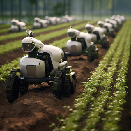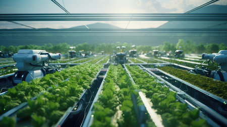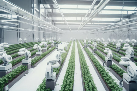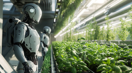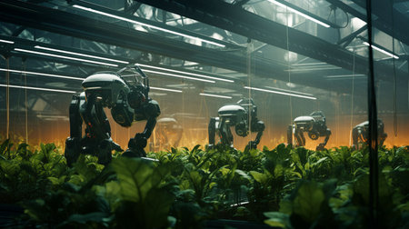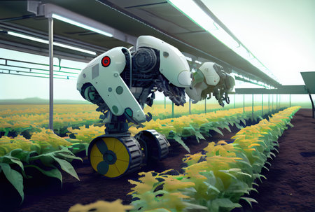 Smart robotic farmers in futuristic automated agriculture AI generated illustration