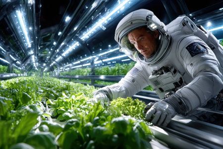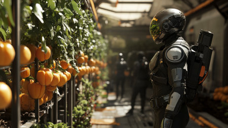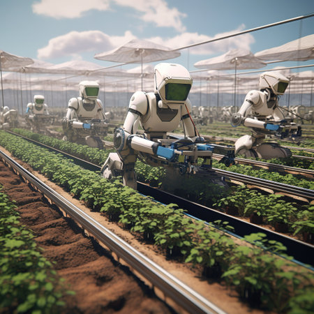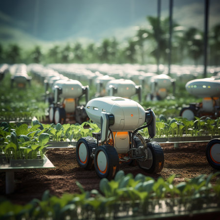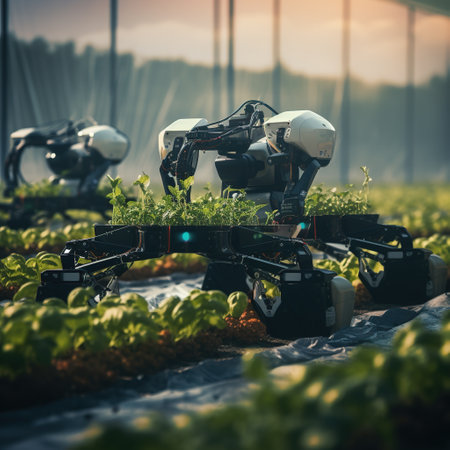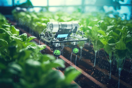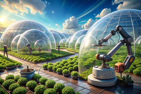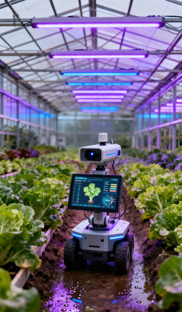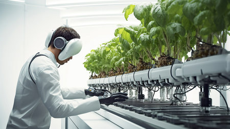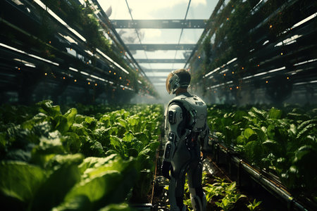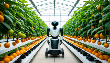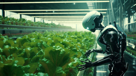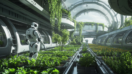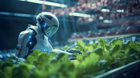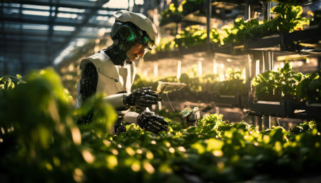 Robotic farmer tending to plants in a futuristic greenhouse