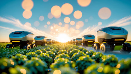 Farming robots working at sunset in a lush agricultural landscape