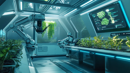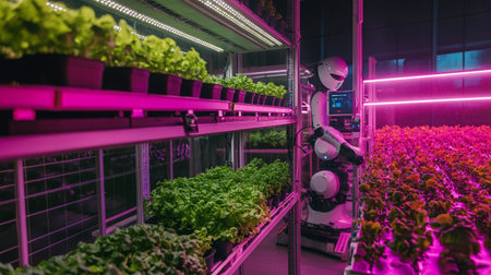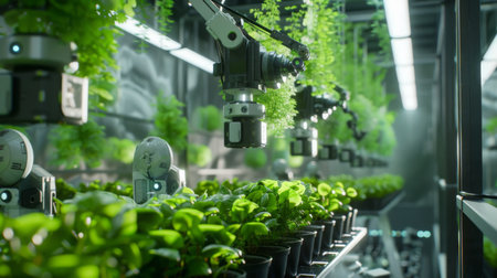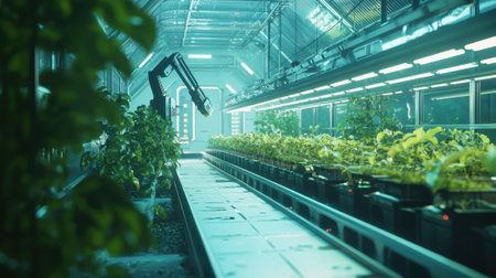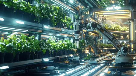 High-tech indoor farm features a robotic arm that carefully maintains and monitors a row of vibrant plants. The environment is illuminated with cool blue lights, enhancing the advanced technology.