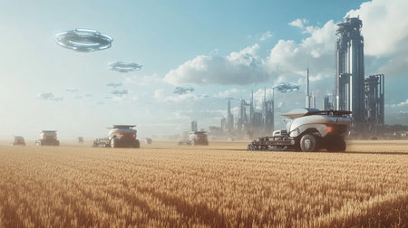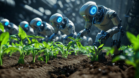 Future of digital agriculture, robots growing and harvesting crops. AI generated.