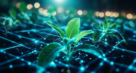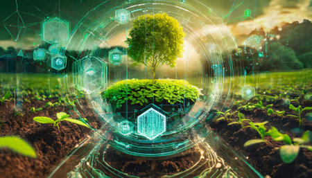 This image captures the fusion of sustainability and technology, showcasing seed planting methods improved by digital tools for eco-conscious agriculture, fostering balance between modern