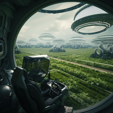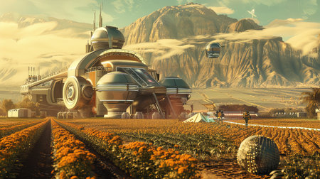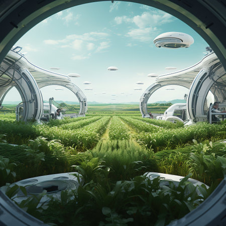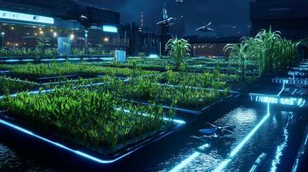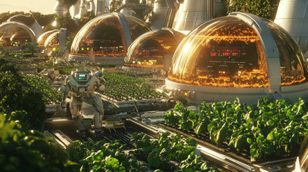 Futuristic smart farm utilizing advanced technology at sunset