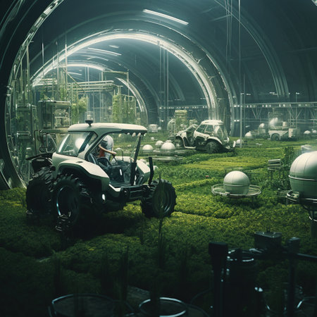 Futuristic agricultural machinery in the greenhouse. 3d rendering.