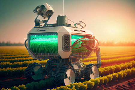 A cutting-edge agricultural robot works diligently in a vast crop field at dusk, showcasing modern farming techniques and innovations.