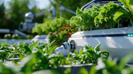 Robot working in hydroponic vegetable garden. Smart agriculture technology.